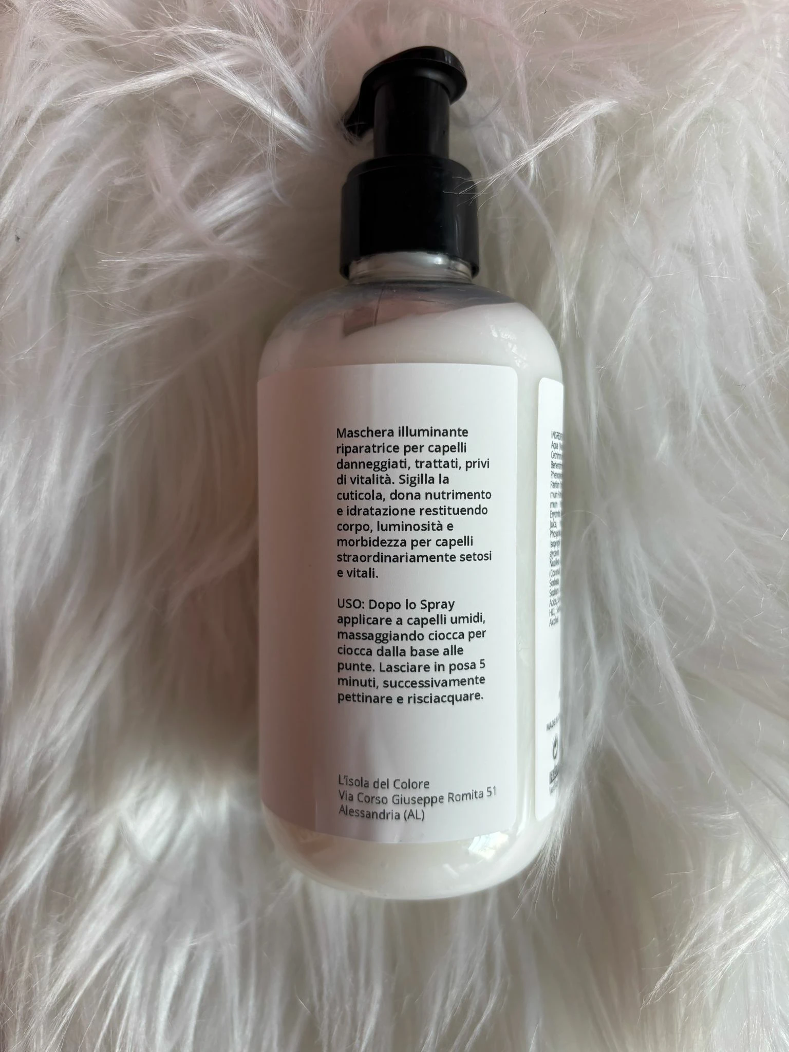 Maschera illuminante riparatrice per capelli danneggiati, trattati, privi di vitalità. Sigilla la cuticola, dona nutrimento e idratazione restituendo corpo, luminosità e morbidezza per capelli